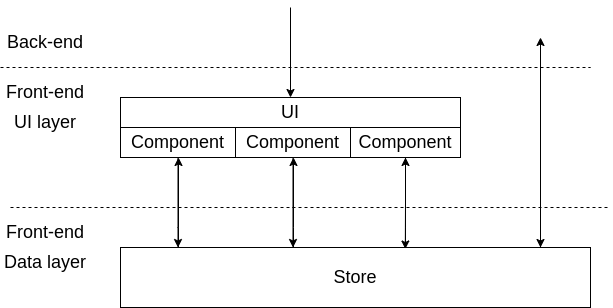 Второй вопрос — зачем нам нужен так называемый store (хранилище данных)? Фундаментально store не обязателен, но на практике почти всегда оказывается, что разные страницы приложения могут взаимодействовать между собой и влиять на поведение друг друга. Это взаимодействие выражается в следующих процессах: